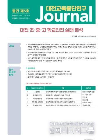 시민행정신문 기자 | 대전교육과학연구원 대전교육정책연구소는 2025년 대전교육종단연구저널 제5호'대전 초·중·고 학교안전 실태 분석', 제6호 '대전 교육가족의 정신건강 현황 분석'을 발간하여 대전 모든 기관 및 전국 교육정책연구소에 안내하고, 대전교육과학연구원 누리집에 공개했다고 밝혔다.