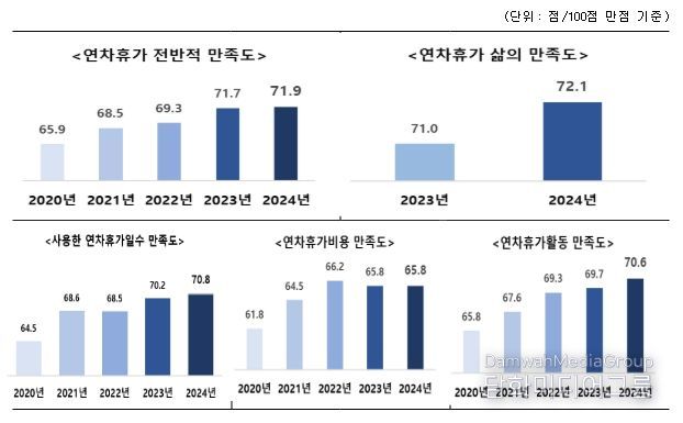 연차 소진율은 79.4%로 전년 대비 1.6%포인트 증가해 근로자 휴가조사를 시작한 2018년 이래 최고치를 나타냈다. 연차 사용 목적으로는 여행이 35%로 2022년 이후 가장 높은 비율을 유지하고 있으며, 그다음으로 휴식 28.6%, 집안일 16.0% 등의 순으로 나타났다.