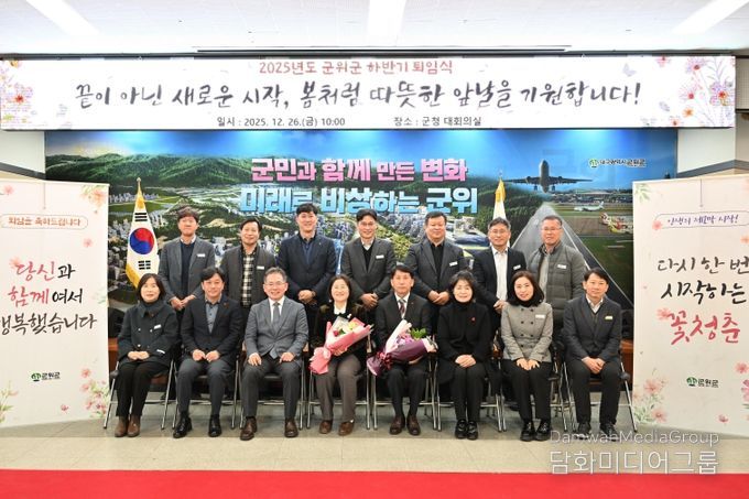 시민행정신문 강갑수 기자 | 군위군은 26일 군청 대회의실에서 2025년 하반기 퇴임식을 개최하고 오랜기간 군정 발전을 위해 헌신해 온 퇴직 공무원의 노고를 되새기며 감사의 마음을 나누는 시간을 가졌다. 이 날 행사에는 김진열 군수를 비롯하여 퇴직 공무원 2명과 가족, 동료 공직자 등 100여명이 참석한 가운데, 공직자로서의 여정을 되돌아보고 감사의 마음을 전하는 뜻깊은 시간이 마련됐다.(사진)
