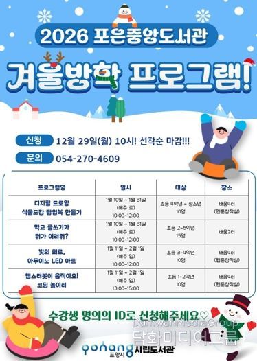 시민행정신문 강갑수 기자 | 포항시립포은중앙도서관은 내년 1월 10일부터 시작되는 겨울방학 프로그램의 수강생을 29일 오전 10시부터 포항시립도서관 홈페이지에서 사전 접수한다.