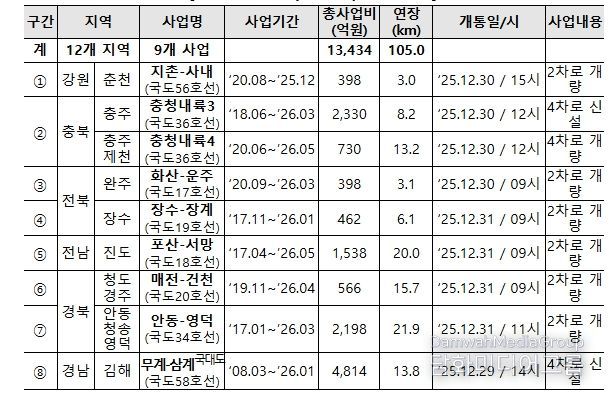 시민행정신문 이세훈 기자 | 국토교통부는 12개 시·군에 국도 신설, 확장 및 개량이 마무리 되어 12월 29일부터 31일까지 국도 105km를 순차적으로 개통한다.