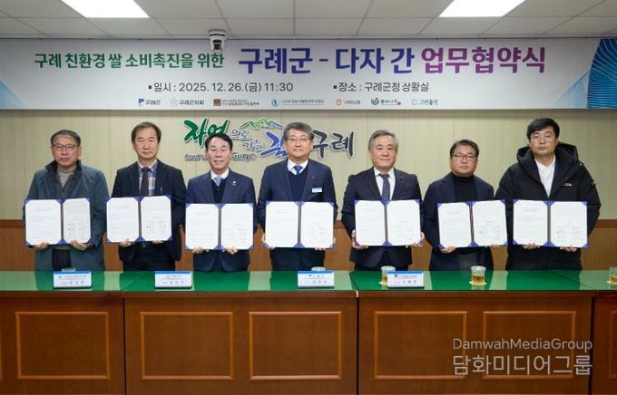 시민행정신문 강갑수 기자 | 구례군은 친환경 농업의 가치를 확산하고 쌀 소비 기반을 강화하기 위해 공공·금융·농협·민간이 참여하는 다자간 업무협약을 지난 12월 26일 군청 상황실에서 체결했다.