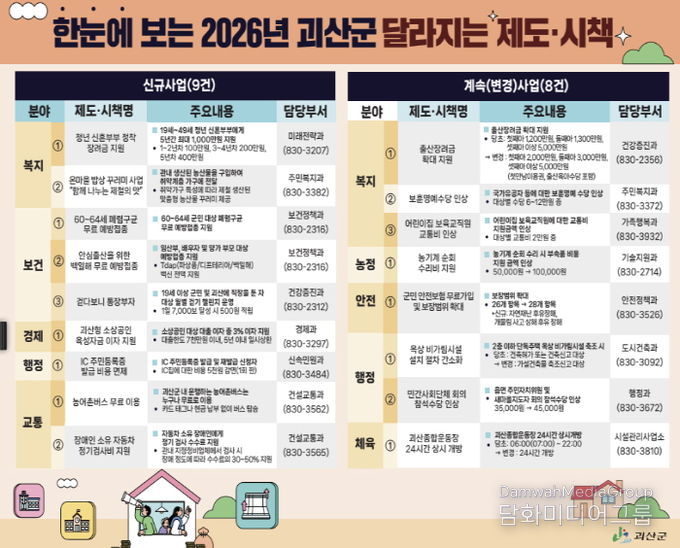 시민행정신문 강갑수 기자 | 충북 괴산군은 2026년 병오년 새해를 맞아 군민의 일상에서 '바로 체감되는 변화'를 만드는 생활밀착형 정책을 본격 시행한다.