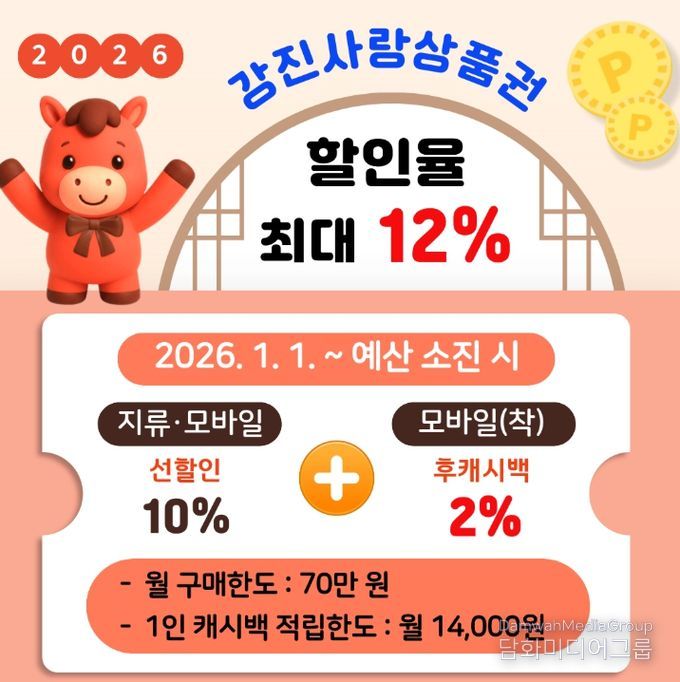 시민행정신문 강갑수 기자 | 강진군이 오는 2026년 적토마의 해를 맞아 지역경제 활성화와 군민 소비 부담 완화를 위해 지역사랑상품권 할인율을 상향 운영한다.
