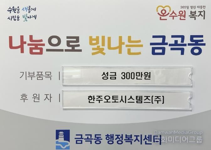 시민행정신문 강갑수 기자 | 지난 29일 수원시 권선구 금곡동 행정복지센터는 한주오토시스템즈(주)로부터 저소득 가정을 지원하기 위한 성금 300만 원을 전달받았다고 밝혔다.
