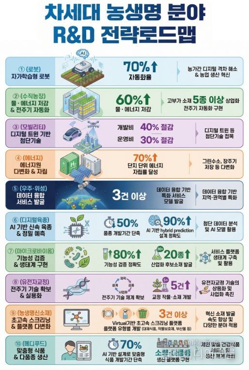 시민행정신문 이존영 기자 | 농림축산식품부는 인공지능(AI), 바이오, 데이터 등 신기술 융합을 기반으로 농산업의 구조적 한계를 극복하고 미래 성장 동력을 확보하기 위해'차세대 농생명 분야 연구개발(R&D) 전략로드맵'을 수립했다. 이는 국정과제의 이행을 뒷받침하기 위한 연구개발(R&D) 전략으로 스마트 데이터 농업 등 미래 신산업 육성을 목표로 한다.