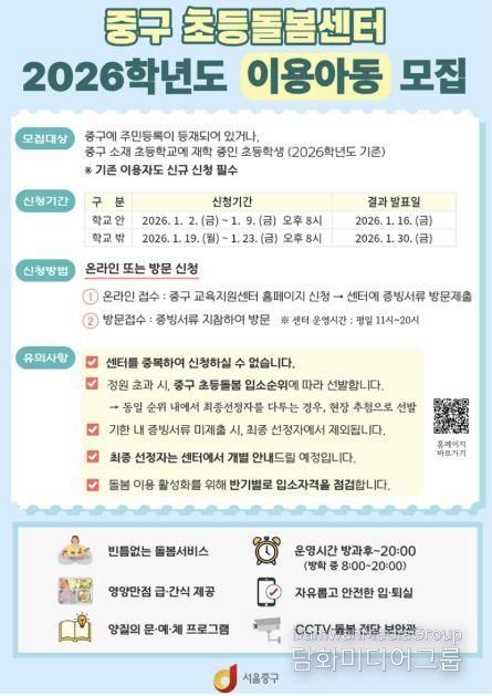 시민행정신문 강갑수 기자 | 서울 중구가 맞벌이 가정과 돌봄 공백이 발생하기 쉬운 가정을 지원하기 위해 2026학년도 새학기 초등돌봄센터 이용아동을 모집한다.