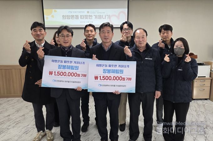 시민행정신문 강갑수 기자 | 인천 미추홀구시설관리공단(이사장 박종구)은 지난 30일 지역사회 공헌 인정제 특별상 수상에 따른 포상금 150만 원 전액을 지적장애인 거주시설인 ‘장봉혜림원’에 기부했다.
