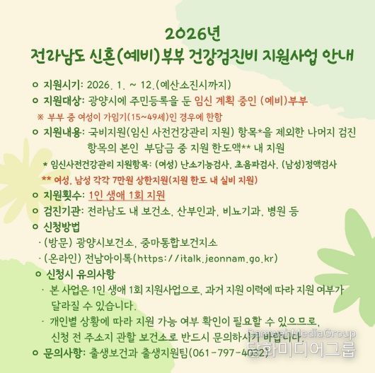 시민행정신문 강갑수 기자 | 광양시는 전라남도가 추진하는 ‘신혼(예비)부부 건강검진비 지원사업’에 맞춰, 2026년에도 임신을 준비하는 부부를 대상으로 건강검진비 지원사업을 지속 운영한다고 밝혔다.