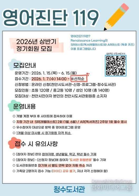 상반기 정기회원 신청은 오는 7일 오후 2시부터 천안시도서관 누리집을 통해 가능하며, 자세한 사항은 청수도서관 영어자료실로 문의하면 된다.
