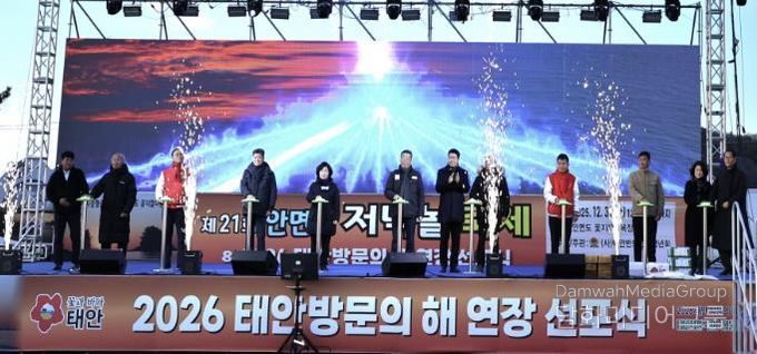 군은 국내 최고 관광휴양도시로의 힘찬 도약을 위해 지난 12월 31일 안면읍 꽃지해안공원 특설무대에서 제21회 안면도 저녁놀 축제를 겸한 ‘2026 태안 방문의 해 선포식’을 열고 두 번째 발걸음의 시작을 널리 알렸다고 밝혔다.