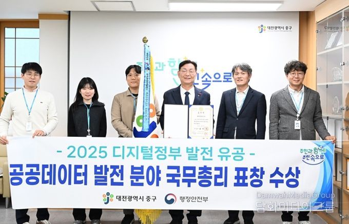 시민행정신문 강갑수 기자 | 대전 중구는‘2025 디지털정부 발전 유공 정부포상’공공데이터 발전 부문에서 전국 기초자치단체 중 유일하게 국무총리 기관 표창을 수상했다고 4일 밝혔다.