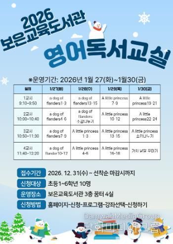 시민행정신문 기자 | 보은교육도서관은 겨울방학을 맞아 관내 초등학생을 대상으로 ‘그림책 독서 교실’과 ‘영어 독서 교실’을 운영한다고 밝혔다.
