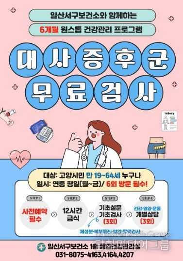 일산서구보건소 1층 통합건강관리실에서는 대사증후군 검진 시 혈액검사(공복혈당, 고지혈증, 간기능, 빈혈 등)와 혈압, 체성분 및 복부둘레를 측정한다. 검사 결과를 바탕으로 간호사․영양사․운동처방사의 개인별 맞춤 상담과 함께 6개월간 체계적인 건강관리 서비스(6회 내소)를 받을 수 있다.