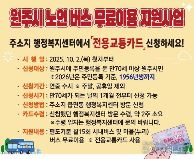 이재순 대중교통과장은 “노인 무료버스 사업은 교통비 절감뿐만 아니라, 어르신들의 사회참여 확대와 건강·복지 증진에도 긍정적인 영향을 주고 있다”라며, “앞으로도 카드 신청과 사용을 적극 독려해 사업이 더욱 활성화되도록 최선을 다하겠다”라고 말했다.