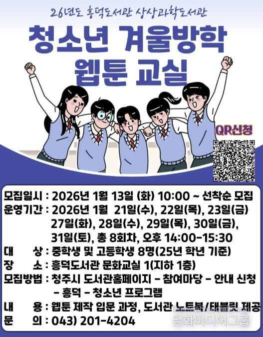 시민행정신문 강갑수 기자 | 청주흥덕도서관은 겨울방학을 맞은 청소년들의 창의력과 표현력을 키우기 위한 ‘청소년 겨울방학 웹툰 공작소’ 참가자를 모집한다고 8일 밝혔다.