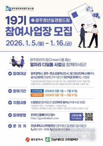 참여를 희망하는 드림터(사업장)는 오는 16일 오후 5시까지 광주청년일경험드림 누리집에서 신청하면 된다.