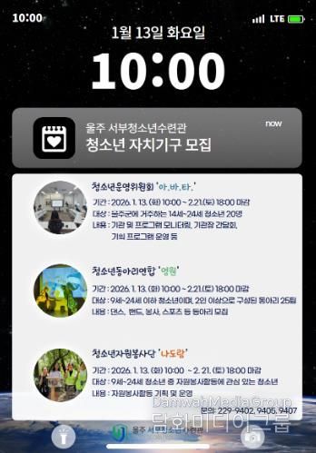 시민행정신문 강갑수 기자 | 울주군시설관리공단 서부청소년수련관은 청소년의 참여 활성화와 자치 역량 강화를 위해 2026년도 청소년 자치기구 신규 참여 청소년을 모집한다고 밝혔다.