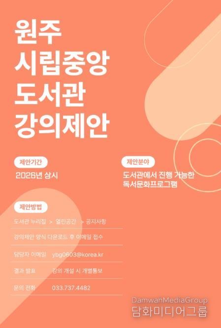 시민행정신문 강갑수 기자 | 원주시립중앙도서관은 다양한 프로그램을 시민들에게 제공하기 위해 강의 제안을 상시 운영한다.