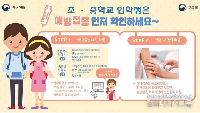 중학교 입학생은 11~12세 예방접종인 ▲Tdap(파상풍·디프테리아·백일해) 또는 Td(파상풍·디프테리아) 6차 ▲일본뇌염 불활성화 백신 5차(또는 약독화 생백신 2차), ▲ HPV(사람유두종바이러스) 1차(12세 여학생만 해당) 등 3종을 모두 접종했는지 확인해야 한다.