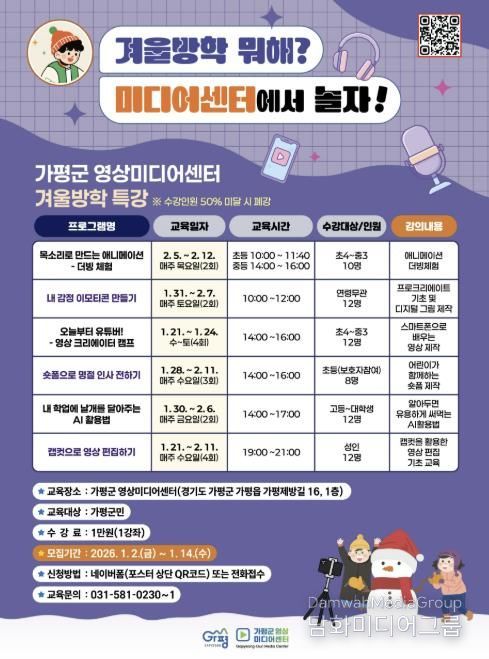 가평군 영상미디어센터는 겨울방학 기간을 활용해 애니메이션, 영상 제작, AI 활용 등 다양한 주제의 ‘겨울방학 특강 프로그램’을 운영한다. 방학을 단순한 휴식이 아닌 배움의 시간으로 채우자는 취지에서 기획된 프로그램이다. 수강료는 1강좌당 1만원이며, 모집 기간은 1월 2일부터 14일까지다.
