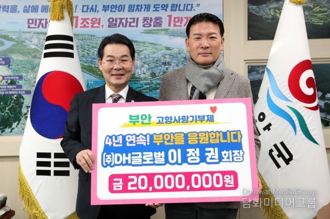 시민행정신문 강갑수 기자 | 부안군은 ㈜DH글로벌 이정권 회장이 고향사랑기부제에 4년 연속 고액기부를 실천하며 지역을 향한 꾸준한 나눔을 이어가고 있다고 밝혔다.