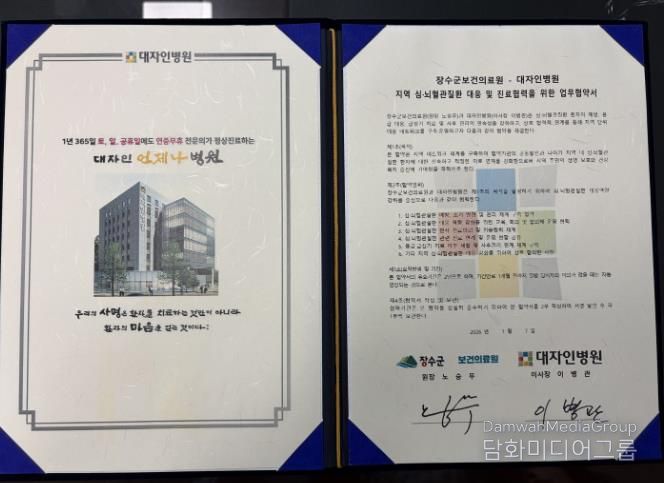 시민행정신문 강갑수 기자 | 장수군은 대자인병원과 심뇌혈관질환 발생 시 신속하고 효과적인 대응을 위해 상호 진료협력 체계를 구축하는 ‘심뇌혈관질환 대응 진료협력 협약(MOU)’을 체결했다고 9일 밝혔다.