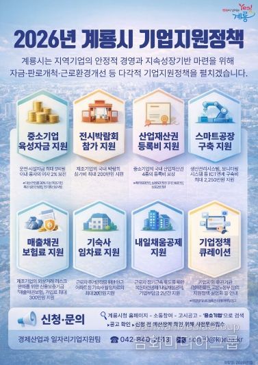 시민행정신문 강갑수 기자 | 충남 계룡시는 지역 기업의 안정적 경영과 경쟁력 강화를 위해 자금·판로·지식재산 등 전 분야를 아우르는 기업지원정책을 1월부터 본격 운영할 계획이라고 밝혔다.