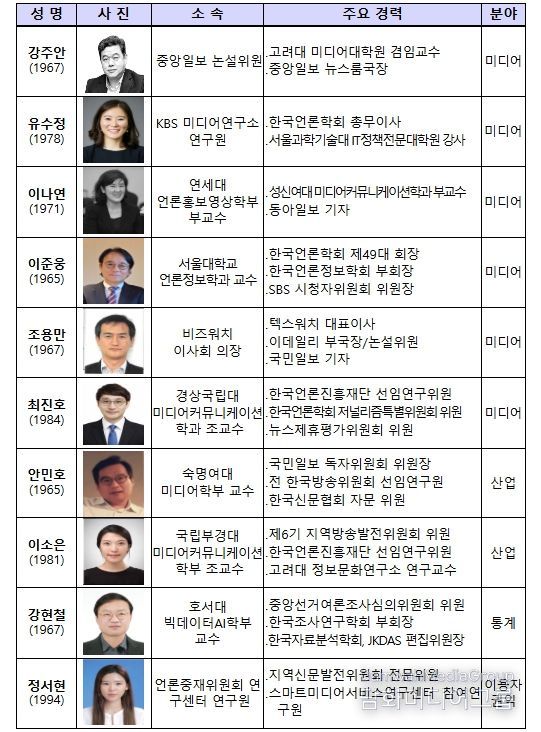 새로 위촉된 위원은 ▴강주안 중앙일보 논설위원, ▴강현철 호서대 빅데이터에이아이(AI)학부 교수, ▴안민호 숙명여대 미디어학부 교수, ▴유수정 케이비에스(KBS) 미디어연구소 연구원, ▴이나연 연세대 언론홍부영상학부 부교수, ▴이소은 국립부경대 미디어커뮤니케이션학부 조교수, ▴이준웅 서울대 언론정보학과 교수, ▴정서현 언론중재위원회 연구원, ▴조용만 비즈워치 이사회 의장, ▴최진호 경상국립대 미디어커뮤니케이션학과 조교수 등으로서, 미디어, 산업, 통계, 이용자권익 분야 등의 전문가로 구성했다.(성명 가나다순)