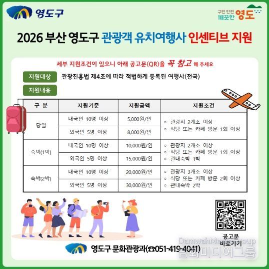 시민행정신문 강갑수 기자 | 부산광역시 영도구는 관광객 유입 확대와 체류형 관광 활성화를 위해 '2026년 관광객 유치 여행사 인센티브 지원 사업'을 추진한다고 밝혔다.