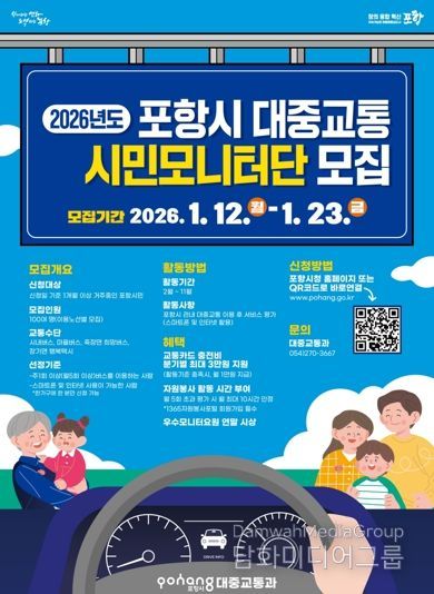 시민행정신문 강갑수 기자 | 포항시가 대중교통 이용자의 불편사항을 현장에서 발굴하고 서비스 품질을 개선하기 위해 오는 12일부터 23일까지 ‘대중교통 시민 모니터단’을 모집한다.