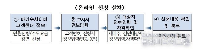 신청방법은 방문신청 또는 온라인신청이 가능하다. 방문 신청은 1월 12일부터 감면받을 주소지 관할 동주민센터에서 우선 접수하며, 온라인 신청은 3월 3일부터 서울아리수본부 누리집 내 아리수 사이버고객센터에서 할 수 있다.