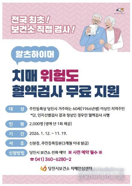 당진시보건소 관계자는 “이번 혈액검사는 치매 진단을 위한 검사가 아닌 만큼 결과에 대한 과도한 불안보다는 예방과 생활 습관 개선의 계기로 삼아주시길 바란다”며 “앞으로도 치매 예방과 조기 관리 강화를 위한 다양한 사업을 지속적으로 추진하겠다”고 전했다.