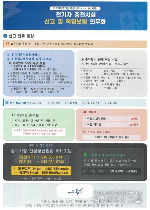 이미 운영 중인 기존 충전시설의 경우에도 법 시행일인 2025년 11월 28일부터 6개월 이내인 2026년 5월 27일까지 신고와 배상책임보험 가입을 완료해야 하며, 이를 이행하지 않을 경우 과태료가 부과된다.