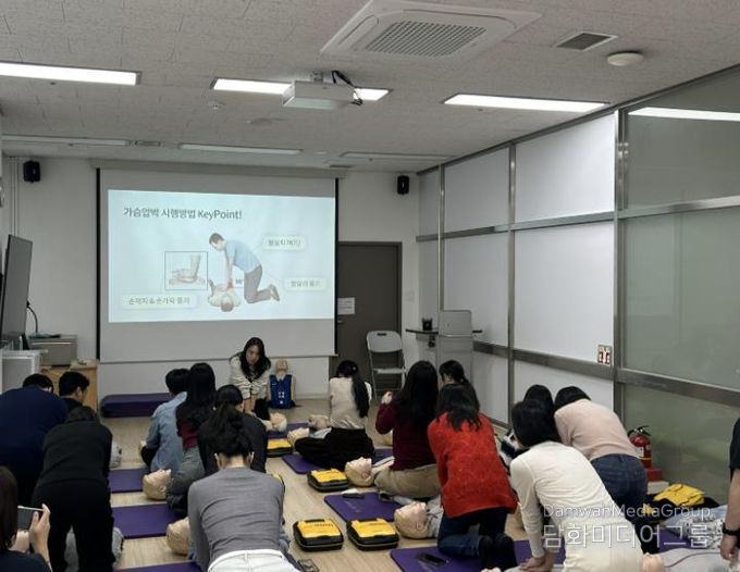 교육 참여자들은 심폐소생술과 자동심장충격기 사용법에 대한 이론을 익힌 후 교육용 인형을 이용해 실습을 병행한다.