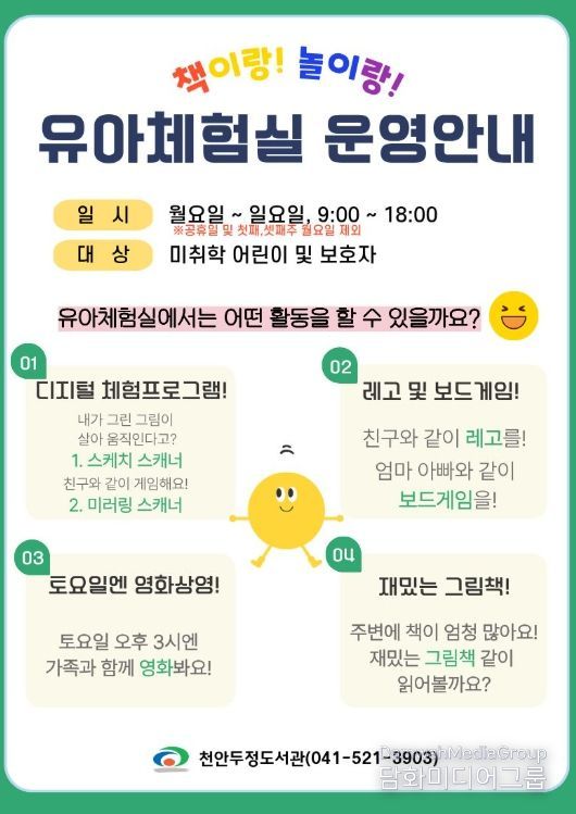 시민행정신문 강갑수 기자 | 천안시 두정도서관은 미취학 아동을 위한 ‘놀이 기반 독서 환경’인 유아체험실을 운영해 주민들로부터 호응을 얻고 있다고 12일 밝혔다.