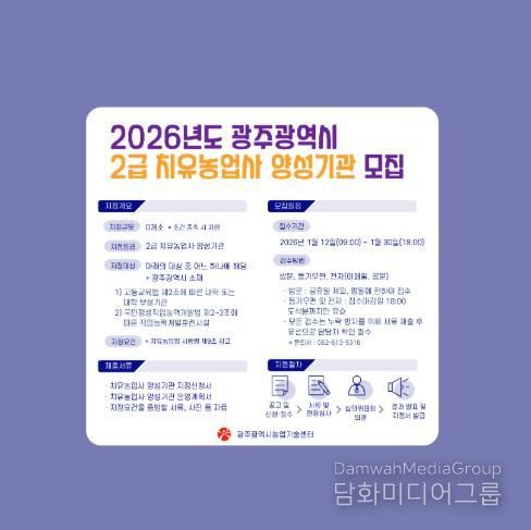 시민행정신문 강갑수 기자 | 광주광역시 농업기술센터는 12일부터 30일까지 ‘2급 치유농업사 양성기관’ 지정을 위한 신청을 받는다.