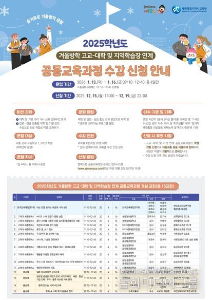 시민행정신문 기자 | 세종특별자치시교육청은 2025학년도 겨울방학을 맞아 고교–대학 및 지역학습장 연계 공동교육과정을 1월 13일부터 1월 16일까지 4일간 고려대학교 세종캠퍼스, 충남대학교, 한국조세재정연구원 등 3개 기관에서 운영한다.