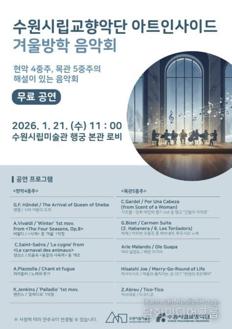 1월 21일 오전 11시에 수원시립교향악단 아트인사이드 '겨울방학 음악회'가 무료로 개최된다. 현악 4중주와 목관 5중주의 해설이 있는 음악회로 상생스의 모음곡 '동물의 사육제' 중 백조, 피아졸라의 '노래와 푸가', 영화 '여인의 향기' OST 중 탱고 ‘간발의 차이로’, 히사이시조의 '하울의 움직이는 성' OST 중 ‘인생의 회전목마’등을 연주한다.