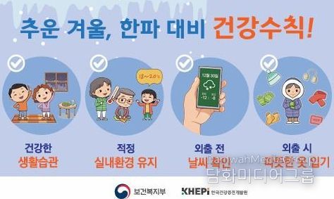 겨울철 한파 대비 건강 수칙으로는 △실내 적정 온도(18~20℃) 및 습도(40~60%) 유지 △ 외출 전 체감온도 확인 △ 외출 시 방한용품 착용 등이 있다.