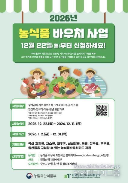 지원 금액은 가구원 수에 따라 차등 지급되는데, 1인 가구 기준 매월 4만 원부터 10인 이상 가구에는 매월 최대 18만 7,000원이 지원되며, 바우처 카드를 사용해 국산 과일, 채소, 육류, 흰 우유, 신선 알류, 잡곡, 두부류, 임산물 등 필수 농식품을 지정된 사용처에서 구매할 수 있다.