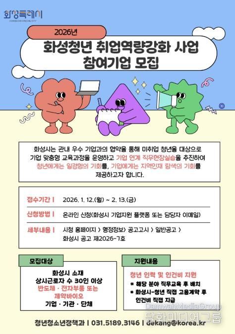 시민행정신문 강갑수 기자 | 화성특례시가 12일부터 다음 달 13일까지 청년 구직자의 실질적인 직무역량 강화와 지역 전략산업 맞춤형 인재 양성을 위한 ‘2026년 화성청년 취업역량강화 사업’ 참여기업을 모집한다.