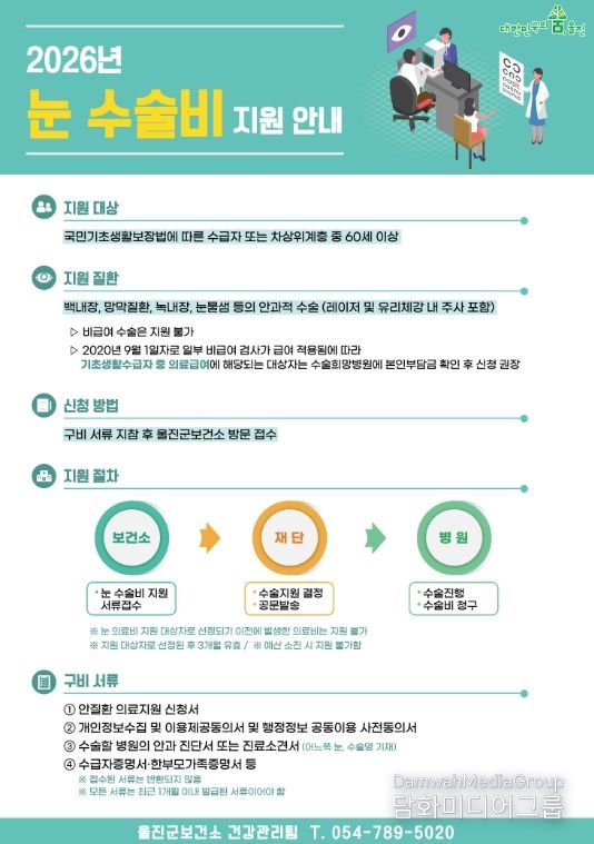 시민행정신문 기자 | 울진군은 60세 이상 저소득층 어르신을 대상으로 2026년 백내장 등 눈 수술비 지원사업을 추진해 노년기 시력 보호와 의료비 부담 완화에 나선다.