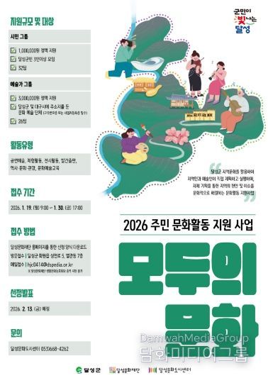 시민행정신문 기자 | (재)달성문화재단 달성문화도시센터는 오는 30일까지 지역 주민과 예술가들의 문화활동 지원 사업 ‘모두의 문화’에 참여할 단체를 모집한다고 12일 밝혔다.
