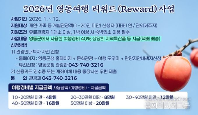 영동군 관계자는 “작년 리워드사업을 통해 예산 투입대비 7배의 지역경제 창출효과가 있었고, 2026년 리워드사업 또한 관광객의 체류를 유도하고 지역 내 소비를 촉진해 지역경제 활성화가 계속해서 이어지길 기대한다”며 “영동을 찾는 관광객들의 많은 관심과 참여를 바란다”고 말했다.