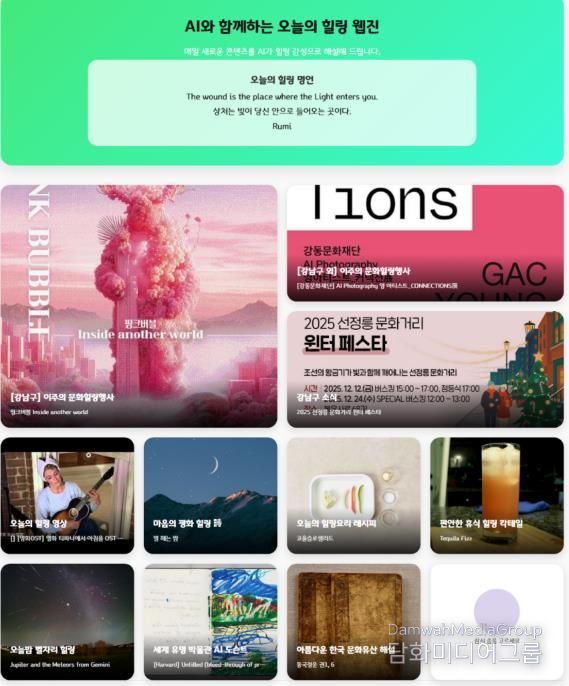 웹진이 제공하는 8가지 핵심 콘텐츠는 인문, 예술, 미식, 정보 등 다방면에서 정서적 안정을 돕는다. 먼저 AI가 엄선한 긍정 메시지인 ‘힐링 명언’과 전 세계 명시를 감성적으로 해설한 ‘힐링 詩’는 문학적 사색을 제공한다. 메트로폴리탄 등 세계적 박물관의 작품을 설명하는 ‘AI 도슨트’와 검증된 영상을 레트로 감성으로 재해석한 ‘힐링 영상’은 시각적 즐거움을 더한다.