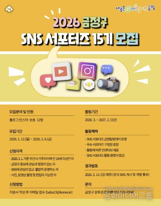 금정구는 오는 2월 6일까지 3개 분야(블로그, 인스타, 숏폼) SNS 서포터즈를 선발할 계획이라고 밝혔다.