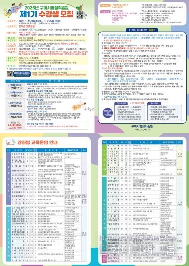시민행정신문 강갑수 기자 | 구미시는 1월 19일부터 23일까지 구미시 통합예약 포털을 통해 2026년 제1기 정기과정 수강생 1,650명을 모집한다. 이번 정기과정은 2월 23일부터 5월 15일까지 5개 과정 69개 강좌가 12주 동안 운영된다.