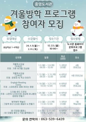 시 관계자는 “긴 겨울방학 동안 아이들이 책과 더욱 친숙해지고 다양한 체험을 통해 몸과 지성이 함께 성장하는 시간이 되길 바란다”며 “앞으로도 시민들의 독서 문화 확산을 위해 수준 높은 프로그램을 지속적으로 발굴해 운영하겠다”고 말했다.