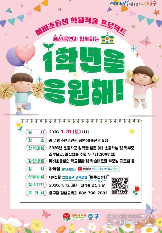 시민행정신문 강갑수 기자 | 인천시 중구는 새 학기를 앞두고 오는 31일 오전 11시 영종국제도시 소재 중구청소년수련관 공연장에서 ‘예비 초등생 학교적응 프로젝트 - 1학년을 응원해!’를 개최한다고 밝혔다.